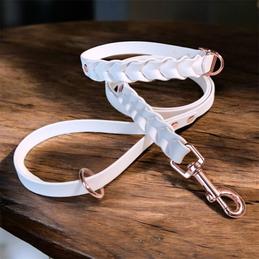 A fehér fonott Biothane szett egy elegáns "Pandora style" nyakörvből és egy 16 mm széles pórázból állnak.