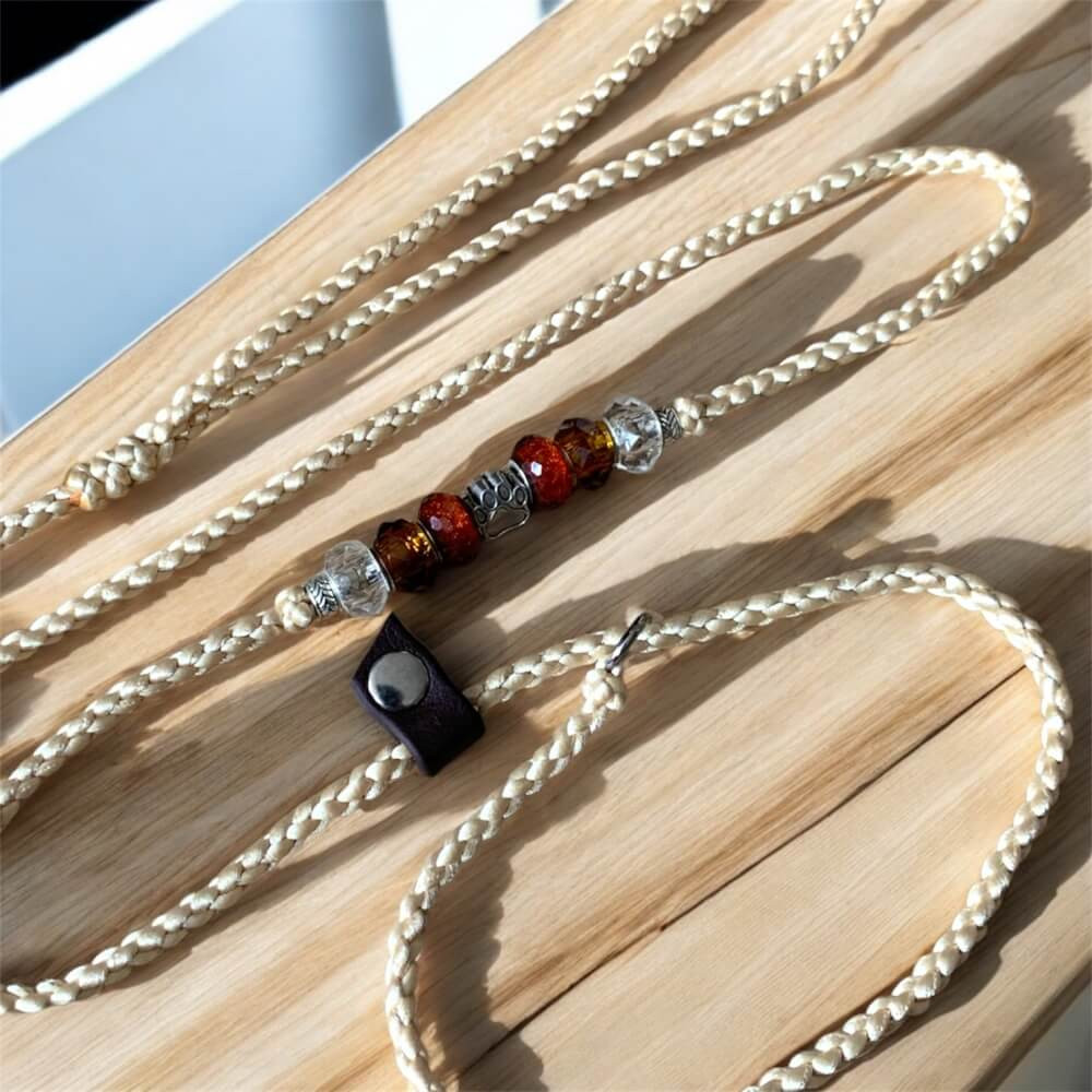 Az elegáns, fonott, ekrü színű gyöngyös felvezető póráz, retriver típusú tökéletes választás bármilyen fajtájú kutya felvezetésére. Teljes hossza: 130 cm. Könnyű és mutatós. Biothane stoppos.